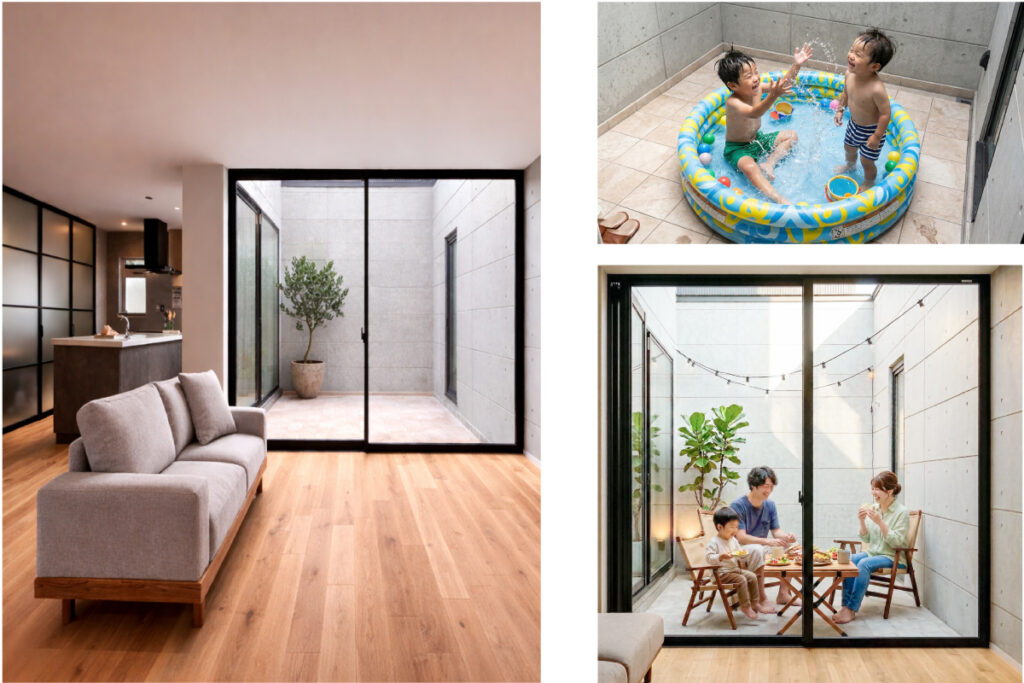 リビング、ダイニング、洗面からすぐ中庭へ。