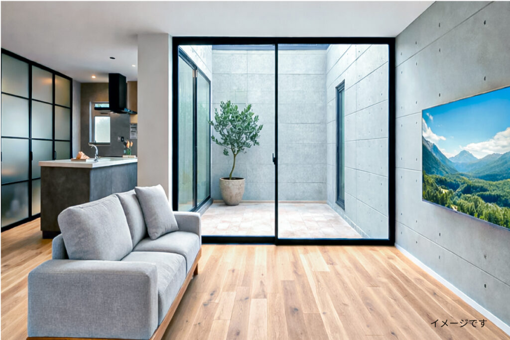 LDKと中庭は全面ガラスの大開口窓で、室内と中庭が一体に。数字以上に広さを感じます。