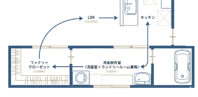 今回のお家の最大の特徴は、主寝室も水回りもファミクロも、