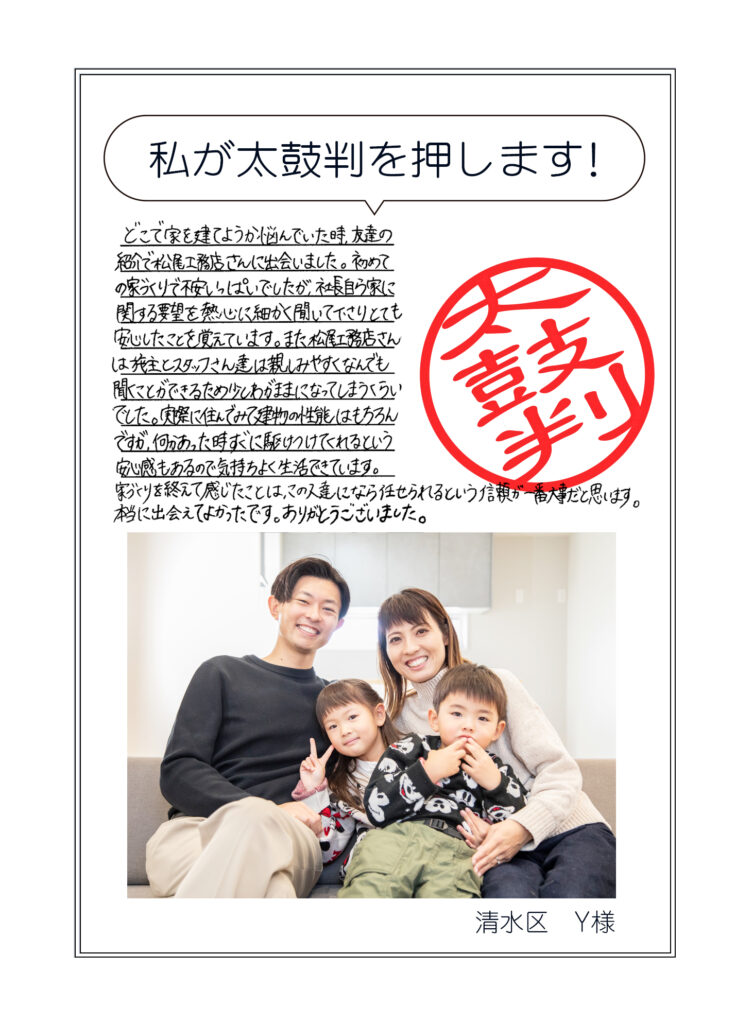 どこで家を建てようか悩んでいた時、友達の紹介で松尾工務店さんに出会いました。初めての家づくりで不安いっぱいでしたが、社長自ら家に関する要望を熱心に細かく聞いてくださりとても安心したことを覚えています。また松尾工務店さんは社長とスタッフさん達は親しみやすく、なんでも聞くことができるため、少しわがままになってしまうくらいでした。実際に住んでみて建物の性能はもちろんですが、何かあった時すぐに駆けつけてくれるという安心感もあるので、気持ちよく生活できています。家づくりを終えて感じたことは、この人達になら任せられるという信頼が一番大事だと思います。本当に出会えてよかったです。ありがとうございました。